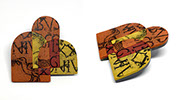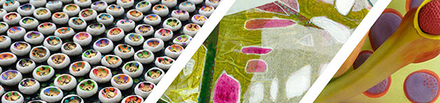 When I used to teach graphic design, one of my favorite typography projects to assign students was abstract letterform compositions. Cutting up and rearranging letterforms allows for appreciation of positive/negative space and the sensual or rigid forms of letters. It forced students to study the specific shapes of letters without the distraction of meaning. All these years later, I've embarked on a series of wearable type collages in that same spirit. The process involves ink toner applied to polymer clay in its uncured (unbaked) form, removing the paper to leave only the image. I add dimension and contrast with bits of colored clay that mirror some of the accidental cut-up letters.