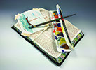 I create environments in collage and three-dimensional still-life arrangements that not only capture moments from daily life but also unfurl fantastical settings from my imagination. Stamps, envelopes, scraps of fabric, and patterned paper detritus are composed in arrangements, setting up compositions and a sense of play of color, texture, and space.
