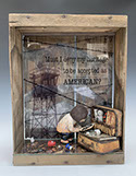 The suitcase represents the “take only what you can carry” rule. The girl is searching for answers/clues of camp life and how it changed generations. What did they choose to take, and what did they bring home? The glass floor keeps the buried memories at bay. Hints are periodically poking out, like an archaeological dig. The guard tower and barbed wire on the glass background represent the barrier to the outside hostile and desolate environment. The quote is as relevant today as it was during World War II. The box is a found produce crate, representing the deplorable living conditions and a nod to the many Japanese farmers.
